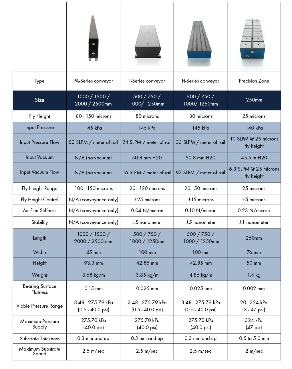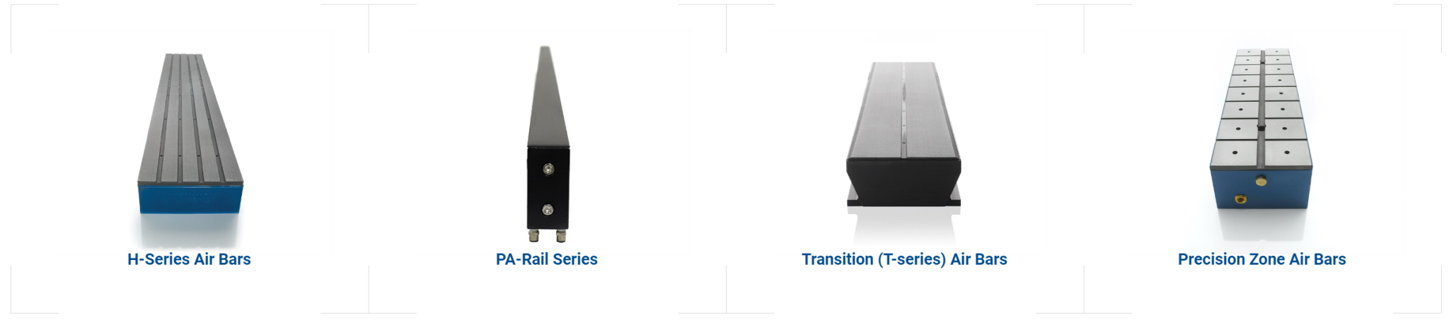 非接触式输送通过四种不同的产品线提供。每条空气棒生产线都有几种标准尺寸以及任何定制尺寸,可以根据需要灵活地排列棒材,以适应各种基板尺寸。通常,两个或多个平板气浮导轨管线集成在一起,以执行基材输送,加工和/或检查的端到端系统。